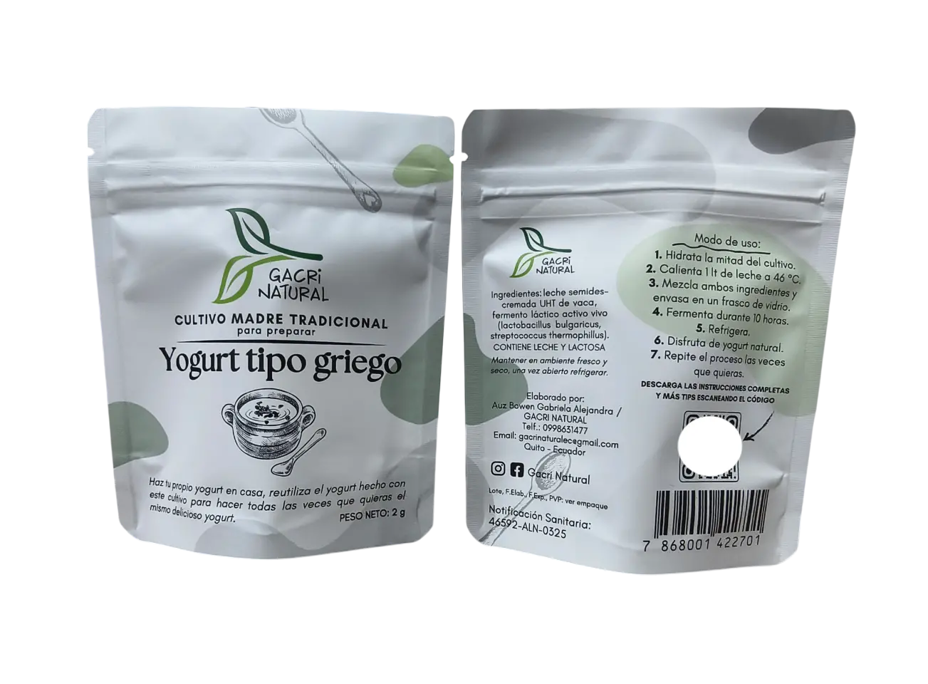 Por la compra de cualquiera de nuestros cultivos te enviamos un manual de instrucciones y asesoría personalizada. Ya no compres más yogurt, hazlo tú mismo, rico, sano y las veces que desees, sin máquinas ni ingredientes artificiales. Producto natural y garantizado con Notificación Sanitaria vigente.